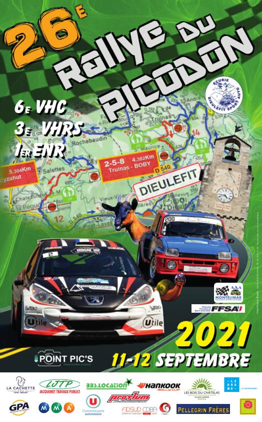| - 26ème Rallye Régional du Picodon 6ème Rallye Régional V.H.C. du Picodon 3ème Rallye Régional V.H.R.S. du Picodon - - 11 et 12 septembre 2021 - -voir les résultats en détail - 26ème Rallye Régional du PICODON -1er - MASCLAUX Arnaud / BONNEFOY Dimitry - SKODA Fabia - (1er Groupe R) 2ème - MOULIN Dominique / CONSTANT Alain - SKODA Fabia 3ème - RISALETTO Rémy / BONHOMME Florian - FORD Fiesta 4ème : BERNARD Benjamin / SCHIIANO Cédric - RENAULT Alpine A110 - (1er groupe RGT) 9ème : DUCLAUX Julien / VATTIER Bruno - RENAULT Mégane - (1er groupe N/FN) 10ème : CARRA Stéphane / BRUN Olivier - BMW M3 - (1er groupe A/FA) 15ème : BRET Nicolas / MUNOZ David - RENAULT Clio - (1er groupe F2000) 17ème : PERIOLAT Olivier / JUNIQUE Sébastien - BMW 135i - (1er groupe GT) 30ème : PANAGIOTIS Jean-Yves / PANAGIOTIS Marie-Thérèse - PORSCHE 911 GT3 Cup - (1er groupe GT+) - - 6ème Rallye V.H.C. du PICODON 1er Groupe 1/2/3/4: POUDREL Stéphanee / TESTUT Bénédicte - Triumph TR7 1er Groupe AJ/BJ/NJ: DELLUC Claude / LAMOTTE Patrice - RENAULT 11 Turbo 1er Groupe Classic: MARTIN Benjamin / CHAMBON Anna - LANCIA Fluvia 1600 HF - - 3ème Rallye V.H.R.S. du PICODON 1er : OLIVIER Gilles / OLIVIER Quentin - VOLKSWAGEN Golf GTI 2ème : MOULIN Mathieu / MOULIN Anaïs - PORSCHE 911 SC 3ème : DAVID Didier / GASTALDI Guy - PEUGEOT 405 MI 16